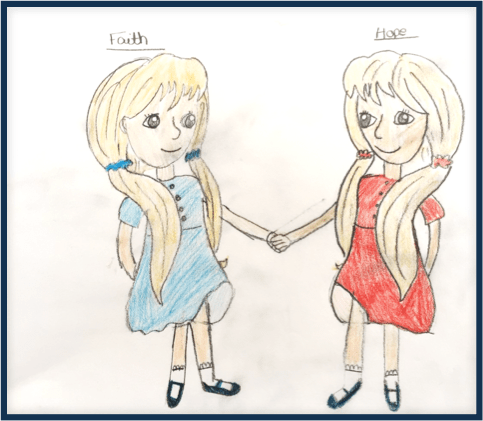 Ahead of them all, Faith and Hope, identical seven-year old twins, were holding hands and trotting along the pavement, kicking off fake snow from their shiny blue shoes, their blonde bunches swinging.