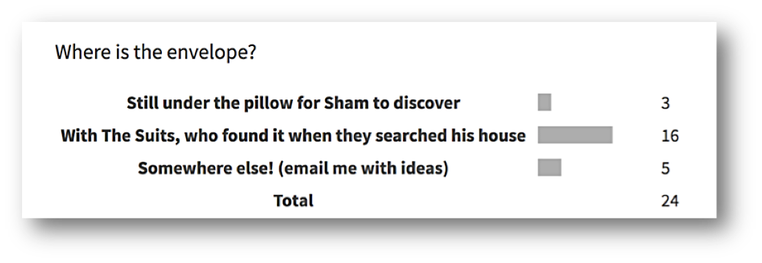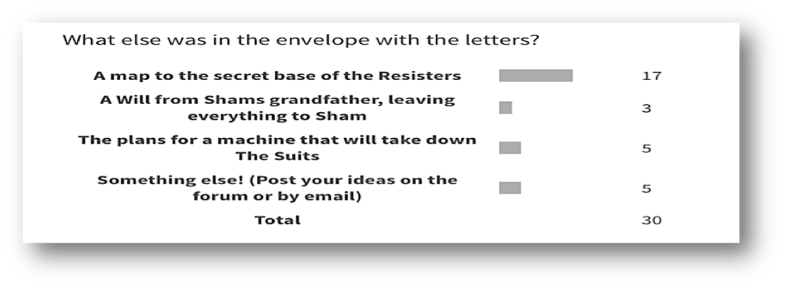 Every week, there was feedback on the previous week’s polls, plus a new poll relating to plot and/or character development. Participation in polls varied, depending on how busy pupils were with school work, but always there was enough engagement to influence the development of the plot or of a particular character. For example, one week, the poll asked children to decide what had happened to a secret envelope that Sham had found and hidden before his ‘arrest’, and the following week, they were asked to guess what else was inside it (use the slider to view both polls):
