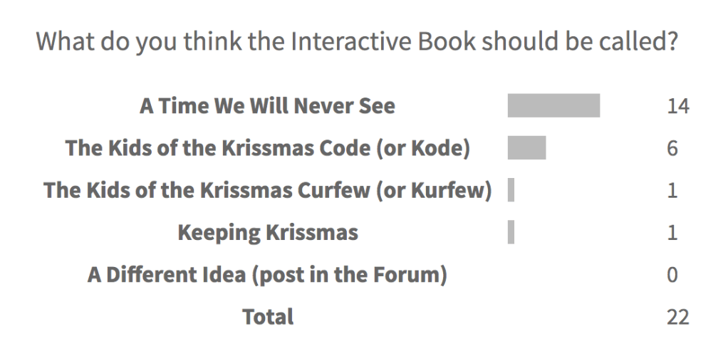 A testimony to the quality of this audio version is the fact that 75% of the audience either just listened to the story or listened whilst reading (this was revealed by a poll – see below). My son’s music and sound effects improved with every chapter – one reader said that it was ‘like going to a movie, just without the pictures’!